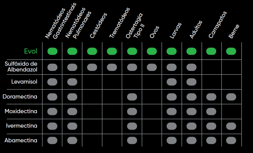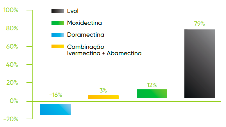 Além do amplo espectro, Evol atingiu 81,2% de eficácia contra cepas resistentes, enquanto as formulações comerciais de moxidectina 1%, levamisol 18,8%, ivermectina 3,15%, doramectina 3,5% e sulfóxido de albendazole 15% atingiram eficácias variando de 27,9% a 74,6% e a combinação de ivermectina 2,25% + abamectina 1,25% se mostra ineficiente em muitas propriedades (BORGES et. al.; Nota Técnica n°5/2023, UFMS).