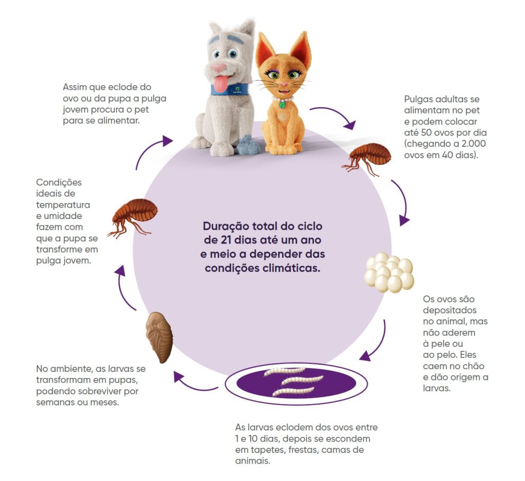 O ciclo biológico da pulga está dividido em duas fases: uma fase de vida parasitária, que ocorre nos pets, em que se alimentam de sangue, e uma fase que ocorre no ambiente. Nos pets é encontrada a forma adulta das pulgas, machos e fêmeas, e no ambiente são encontradas as minúsculas formas jovens ou imaturas: ovos, larvas e pupas.